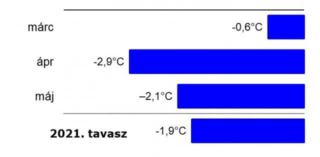 A 2021. tavasz országos átlagban 1,9 °C-kal bizonyult hidegebbnek a megszokottnál (3. ábra). A hónapokat külön-külön tekintve láthatjuk, hogy a március még csak kis mértékben, 0,6 °C-kal maradt el a normáltól, míg az áprilisi és a májusi középhőmérsékletek 2,9 és 2,1 °C-kal, azaz jelentősen eltérnek az ilyenkor szokásos hőmérsékletektől.