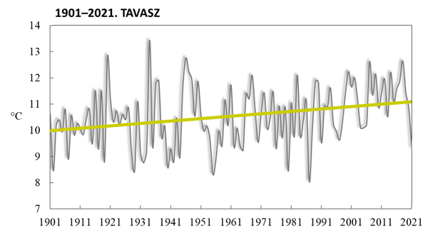 Az 1901-től kezdődő idősorban az idei tavasz a 17. leghidegebb lett (I. táblázat). Lassú emelkedést figyelhetünk meg az elmúlt 121 év tavaszi középhőmérsékleteiben (4. ábra). Az adatokhoz illesztett lineáris trend 1,1°C-os melegedést mutat az 1901–2021-es időszakban.