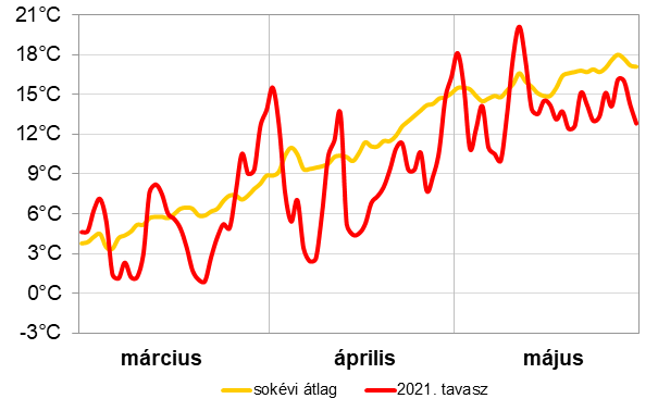 2021 tavasza a megszokottnál hidegebb és átlagosan csapadékos volt. Mindhárom hónap hőmérséklete a normálérték alatt alakult, az áprilisi és májusi középhőmérséklet jelentősen elmaradt az ilyenkor megszokottól. A csapadékviszonyokat tekintve az egyes hónapok változatos képet mutattak. Márciusban jelentős csapadékhiány mutatkozott, míg a május csapadékosabb volt a szokásosnál.