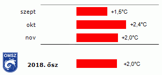 Mindhárom hónap a sokéves átlag felett alakult. A szeptember 1,5°C-kal, a november pedig 2°C-kal volt melegebb az ilyenkor megszokottnál (3. ábra). Az őszi hónapok közül októberben adódott a legnagyobb, 2,4°C-os anomália, és ezzel a 7. legmelegebb októbert tudhattuk magunk mögött. A teljes őszi időszak 2°C-kal meghaladta az ilyenkor szokásos értéket, és ezzel a 2. legmelegebb ősz múlt el 1901 óta.