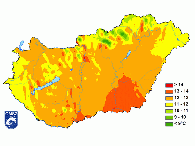 Az őszi középhőmérséklet 12-13°C között alakult az ország nagy részén (1. ábra). A Maros-Körös közén és a Duna alsó szakaszán 13-14°C, míg a hegyvidékeken 9-10°C volt a jellemző. Melegebb, 14°C-ot meghaladó középhőmérsékletű területek csak szűk régióban, Budapest és Szeged környékén jelentkeztek. Országos átlagban az ősz középhőmérséklete 12,3°C-nak adódott. Az évszak során a legmelegebb Pitvaros állomáson volt 35,3°C-kal, melyet szeptember 2-án mértünk, a legalacsonyabb hőmérsékletet pedig Zabaron regisztráltuk november 29-én -12,1°C-kal.