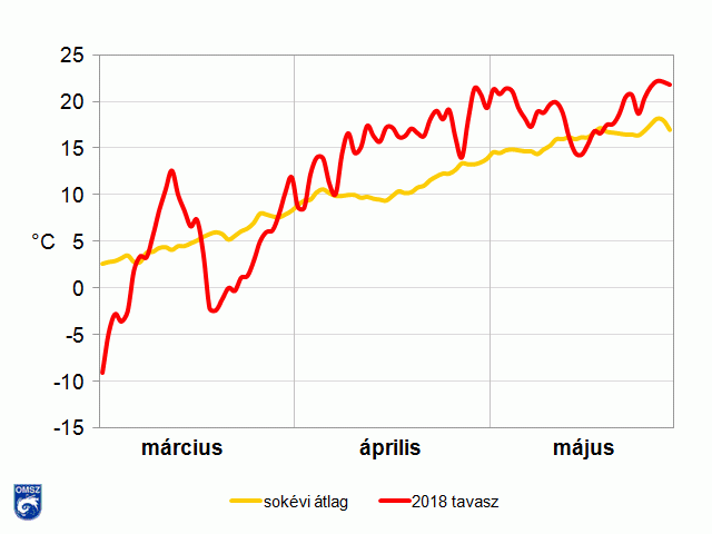 A 2018-as tavasz országos átlagban 1,8°C-kal volt melegebb az ilyenkor szokásosnál (3. ábra). A hónapokat külön-külön tekintve láthatjuk, hogy az áprilisi és a májusi középhőmérsékletek átlag felettiek voltak, az előbbi 4,6°C-kal, az utóbbi 2,9°C-kal haladta meg a normál értékét, míg a márciusi érték 2,1°C-kal elmaradt az ilyenkor megszokottól. 2018 áprilisa a legmelegebbnek, májusa pedig a harmadik legmelegebbnek adódott 1901 óta. Ez utóbbi csupán 0,1°C-kal maradt el a valaha mért legmelegebb májusi középhőmérséklettől, melyet 2003-ban mértünk.