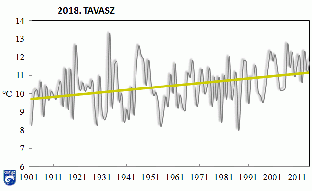 Az 1901-től kezdődő idősorban az idei tavasz a 3. legmelegebb lett (I. táblázat). Az adatokhoz illesztett lineáris trend alapján emelkedést figyelhetünk meg az elmúlt 118 év tavaszi középhőmérsékleteiben (4. ábra).