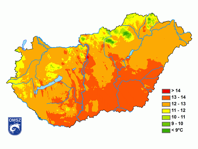 Az ország nagy részén 12-13°C között alakult a tavaszi középhőmérséklet értéke (1. ábra). Budapest környéke bizonyult a legmelegebbnek, a háromhavi középhőmérséklet értéke itt meghaladta a 14°C-ot, leghidegebb pedig az Északi-középhegység magasabban fekvő területein volt (9°C alatt). Évszakos átlagban a legmelegebbet Pécs Egyetem állomáson (13,9°C), a leghidegebbet pedig Kékestetőn (7,7°C) figyelték meg.