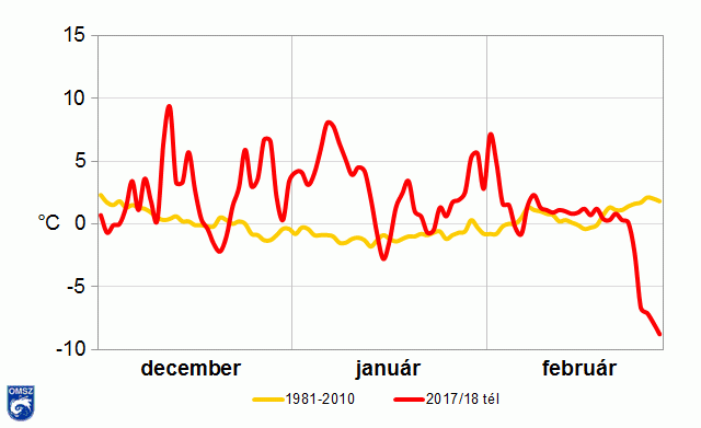 A következőkben összefoglaljuk, hogyan változott az országos átlagban vett napi középhőmérséklet a 2017/2018-es tél során. (5. ábra)