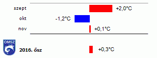 A szeptember jelentősen melegebbnek adódott, 2 °C-kal haladta meg az 1981-2010-es átlagot. A november átlag körüli volt, 0,1 °C-kal enyhébb volt a megszokottnál, míg az október hűvösebbnek bizonyult a normálnál (3. ábra). A teljes őszi időszak 0,3 °C-kal meghaladta az ilyenkor szokásos értéket.