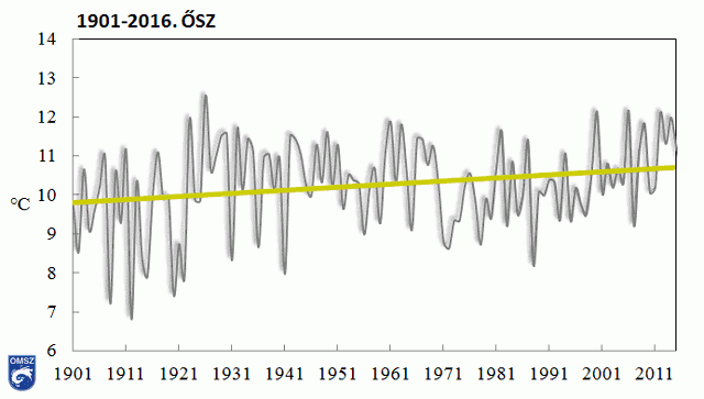 Az őszi középhőmérsékletek 1901-ig visszanyúló idősorát tekintve az illesztett trendvonal egy melegedés irányába mutató tendenciát mutat (4. ábra).