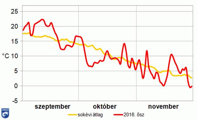 Az ősz legmelegebb napja szeptember 11-e volt 22,3 °C-os országos átlaghőmérséklettel. Az átlagosnál jóval melegebben indult a szeptember (5. ábra), melyet egy hetes hűvösebb időszak követett. A hónap közepén a megszokottnál ismét jóval (5-7 °C-kal) melegebb napok következtek. Néhány nap kivételével szeptember végétől egészen október közepéig a normálnál hűvösebb volt az idő. Ezt követően melegebb és hűvösebb periódusok váltották egymást. November elején és közepén magasabb volt a megszokottnál az országos átlaghőmérséklet, egyes napokon akár 6-7 °C-kal is meghaladta a sokéves átlagot. A hónap végén azonban fagypont alatti átlaghőmérsékletek is előfordultak. Az ősz leghidegebb napja november 29-e lett, -0,5 °C-kal.