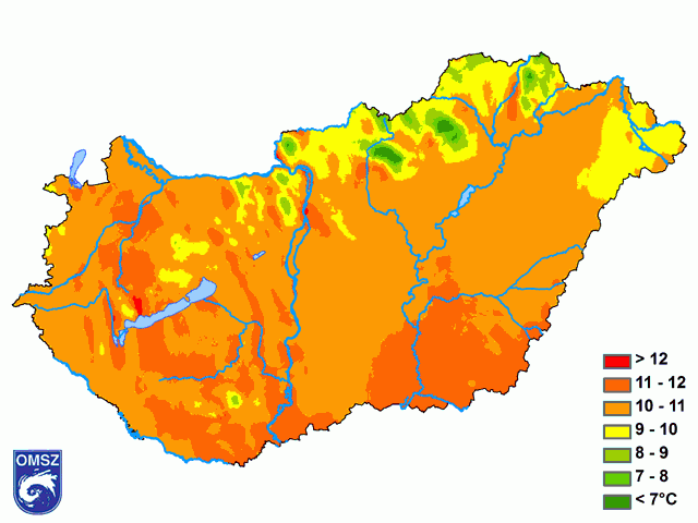 Az ország túlnyomó részén 10-11 °C között alakult az őszi átlaghőmérséklet (1. ábra). A Dunántúl egyes részein, valamint a Dél-Alföldi területeken 11-12 °C, míg a hegyvidékeken 7-9 °C volt a jellemző. Melegebb területek kisebb körzetekben jelentek meg, a legmagasabb – 12 °C-ot meghaladó – középhőmérsékletű terület Budapest környékén és a Balaton-felvidék nyugati részén jelentkezett. Országos átlagban az ősz középhőmérséklete 10,6 °C-nak adódott; állomásaink közül évszakos átlagban a legmelegebb Budapest Állatkert állomásunkon (12,5 °C), a leghidegebb pedig Kékestetőn (6,3 °C) volt.