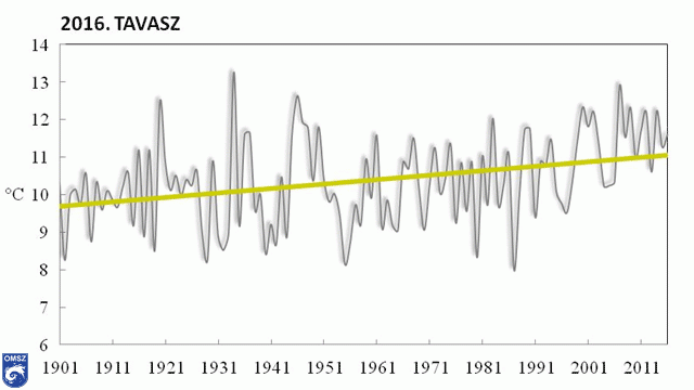 Az 1901-től kezdődő idősorban az idei tavasz a 20. legmelegebb lett (I. táblázat). Az adatokhoz illesztett lineáris trend alapján lassú emelkedést figyelhetünk meg az elmúlt 116 év tavaszi középhőmérsékleteiben (4. ábra).