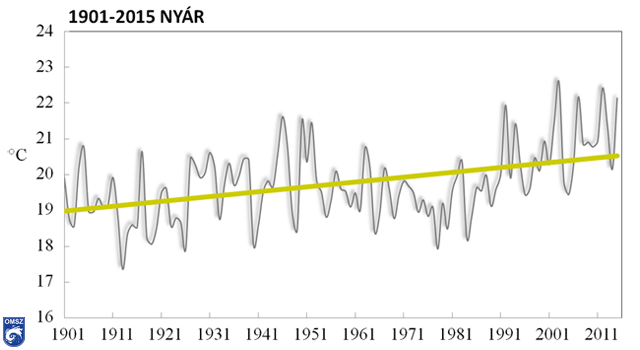Az elmúlt 115 év nyári középhőmérsékleteit tekintve (4. ábra) 2015 nyara a legmelegebbek között foglal helyet. Az évekhez illesztett trendvonal lassú emelkedést jelez.
