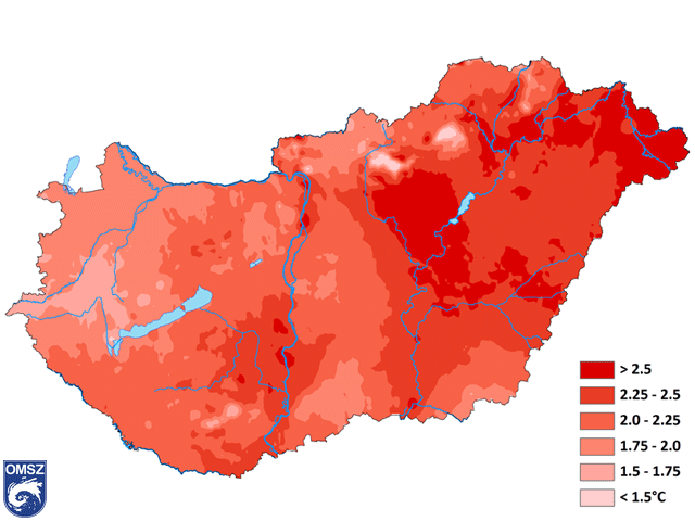 2. ábránkon jól látható, hogy az 1981-2010-es átlagnál alacsonyabb évszakos értékek sehol sem jelentkeztek, a teljes téli időszakot tekintve mindenhol melegebb volt a megszokottnál. A normált leginkább meghaladó értékek a keleti országrészben voltak jellemzőek, itt sokszor 2.5 °C-nál is nagyobb anomáliák léptek fel.