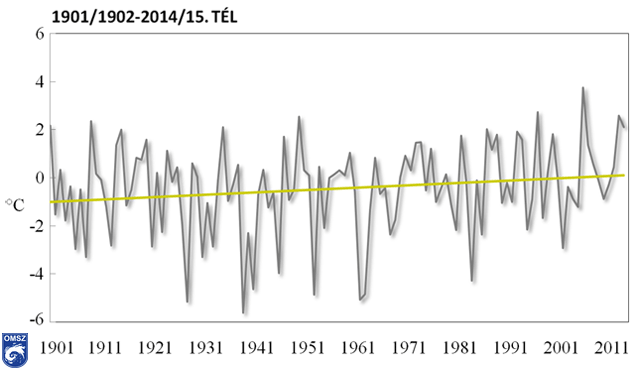A téli középhőmérsékletek 1901-ig visszanyúló idősorát tekintve az illesztett trendvonal a melegedés irányába mutató tendenciát mutat (4. ábra).