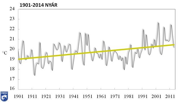 Az elmúlt 114 év nyári középhőmérsékleteit tekintve (4. ábra) 2014 nyara a melegebbek között foglal helyet, ugyanakkor 2006 óta az első olyan nyári időszak, mely nem az első 15 legmelegebb között szerepel. Az évekhez illesztett trendvonal lassú emelkedést jelez.