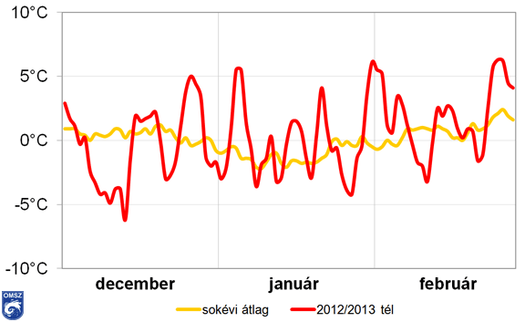 A következőkben összefoglaljuk, hogyan változott az országos átlagban vett napi középhőmérséklet a 2012/13-as tél során.