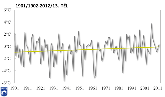 A téli középhőmérsékletek 1901-ig visszanyúló idősorát tekintve az illesztett trendvonal egy igen gyenge, melegedés irányába mutató tendenciát mutat (4. ábra). Az idei tél a melegebb telek között foglal helyet, de nem képvisel kiugró értéket.