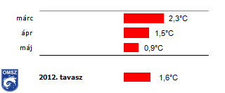 Az idei tavasz minden hónapja melegebb volt a szokásosnál, a legnagyobb eltérés márciusban adódott, amikor is 2.3°C-kal haladta meg az országos havi középhőmérséklet a normál értéket, a legkisebb eltérést pedig május mutatta, 0.9°C-os pozitív anomáliával (3. ábra). Ennek megfelelően az országos évszakos középhőmérséklet is meghaladta az 1971-2000-es átlagot, méghozzá 1.6°C-kal.