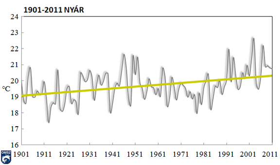 Az elmúlt 111 év nyári középhõmérsékleteinek sorában az idei, átlagosnál melegebb nyár nem képvisel kiugró értéket (4. ábra), de látható, hogy a melegebb évek között foglal helyet, egész pontosan a 16. legmelegebb nyár volt (I. táblázat). Az évekhez illesztett trendvonal lassú emelkedést jelez.