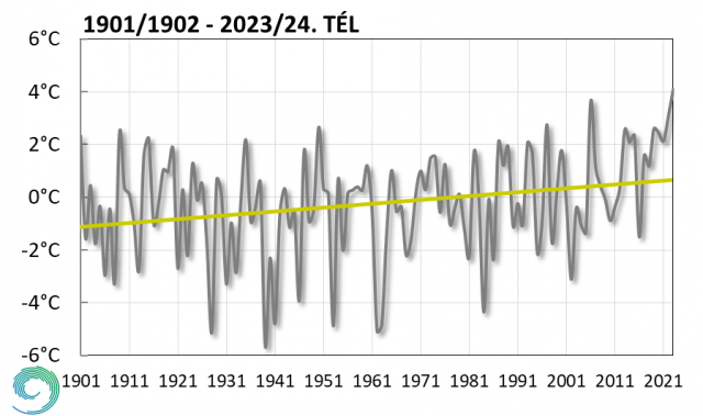 A téli középhőmérséklet idősora 1901 óta a lineáris trendbecslés alapján melegedő tendenciát mutat (4. ábra). Az évszakos középhőmérséklet országos átlagának változása 1901 – 2024 között +1,79 °C. A 2012/2013-as tél óta – egy kivétellel, 2016/2017-ben – minden télen a sokévesnél magasabb volt a háromhavi átlaghőmérséklet.