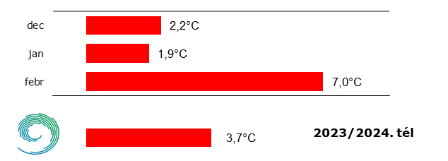 A mostani tél bizonyult a legmelegebbnek az 1901 óta íródó hosszú éghajlati sorban. Az eddigi legmelegebb téli időszak 2006/2007-ben volt, melyet most már 0,5 °C-kal előz meg a 2023/2024-es. Az évszak hónapjai szintén elől végeztek az elmúlt 124 év rangsorában: a december tizenkilencedik, a január huszadik, a február pedig az abszolút legmelegebb lett (I. táblázat).