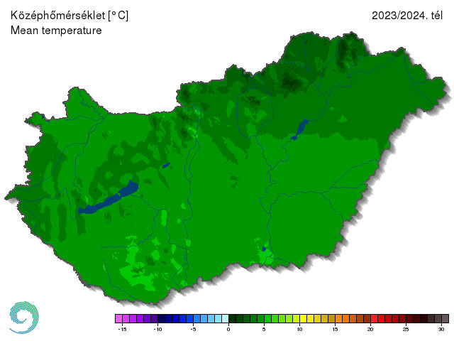 Magyarország legnagyobb részén a tél középhőmérséklete 0 és 6 °C között alakult (1. ábra). Fagypont alatti évszakos átlag a korábbiakkal ellentétben ezen a télen nem fordult elő. A középhegységeinkben volt hűvösebb, 0 és 3 °C közötti átlagokkal, az Alföldön és a Dunántúlon már 3-5 °C közötti értékek voltak jellemzőek. A legmelegebb térségek ezúttal is a Mecsek, Budapest és Szeged környéke voltak, ezeken a tájakon 5 °C felett alakult a háromhavi átlaghőmérséklet. A legalacsonyabb évszakos átlag Kékestetőn adódott (0,5 °C), míg a legmagasabb értéket Boda állomáson kaptuk (5,7 °C).