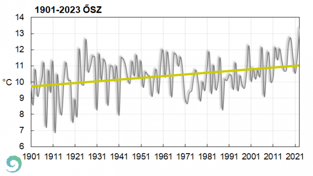 A 2023. ősz a legmelegebb lett az 1901-től kezdődő rangsorban (4. ábra). Az évszak középhőmérséklete 13,3 °C, ezzel több, mint fél fokkal múlta fölül az eddigi legmelegebb, 2019-es őszt (12,7 °C). Mindhárom hónap pozitív anomáliával zárt, a szeptemberben 3,5°C-kal, októberben 3,4 °C-kal, míg novemberben 0,8 °C-kal volt melegebb az 1991-2020-as normálnál.