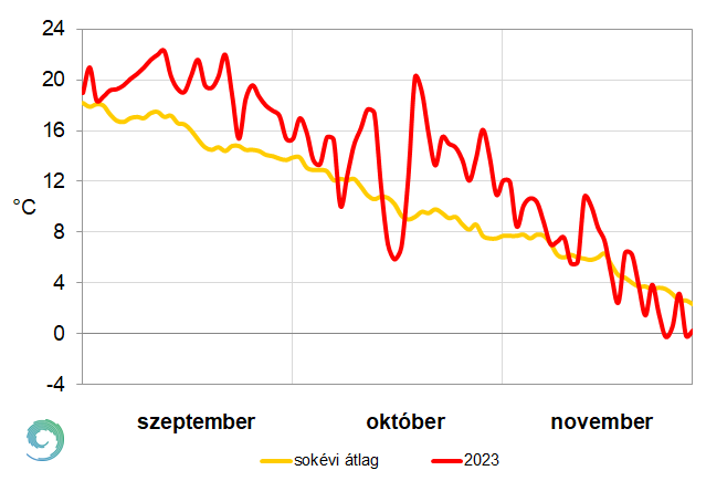Az 5. ábrán a 2023-as ősz napi középhőmérsékleteit és a sokéves átlag értékeit mutatjuk be. Az ábrából jól látszik, hogy szeptember az átlagosnál kissé melegebb idővel kezdődött.
