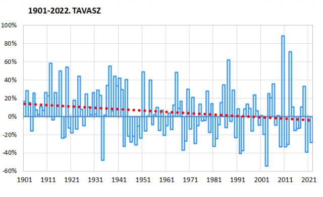 2022 tavaszának a csapadéka átlag alatti volt. Az elmúlt 122 év tavaszainak éves csapadékösszegéhez illesztett trend csökkenést mutat (9. ábra).