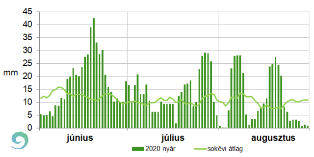 A 2020-as nyár országos átlagban vett, 5 napos csapadékösszegei és a sokévi (1981-2010-es) átlag (mm) - az adott dátumhoz tartozó érték az addig lehullott 5 napos összeget jelöli
