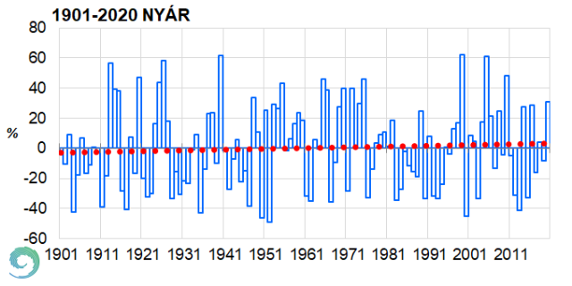 Az országos nyári csapadékösszegek százalékos eltérése a sokévi (1981-2010-es) átlagtól 1901 és 2020 között (interpolált adatok alapján)