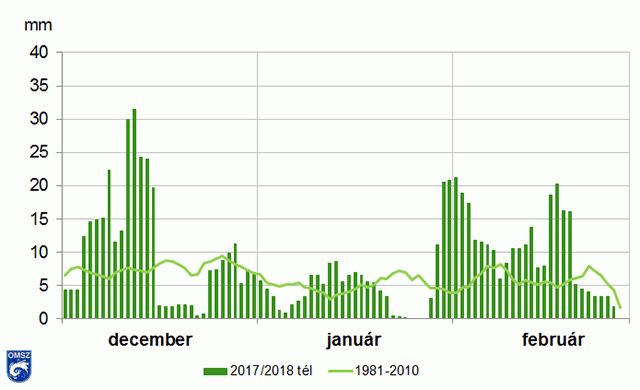 Országos átlagban 2017/2018 telén a megszokott csapadékmennyiségnél 42%-kal több hullott le.