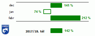Az évszak hónapjait tekintve (8. ábra) a februárt emelhetjük ki, amely csapadékban igen gazdag volt, az 1981-2010-es átlag több, mint kétszerese, országos átlagban 69 mm hullott le, ezzel a 9. legcsapadékosabb februárnak számít a mérések kezdete óta (II. táblázat). 2017 decemberében is az átlagosnál több csapadék hullott (1981-2010-es átlag 141%-a), az országos átlagban 66 mm-rel a rangsorban a 21. legcsapadékosabb december volt. A januári csapadékmennyiség (24 mm) egynegyeddel maradt el a sokévi átlagtól. Összességében az idei tél a 17. legcsapadékosabb volt 1901 óta, igen hasonló a 2015/2016-os télhez.