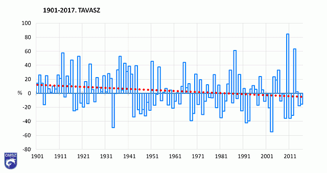 2017 tavaszának csapadékösszege átlag alatti volt. Az elmúlt 117 év tavaszainak éves csapadékösszegéhez illesztett exponenciális trend csökkenést mutat (9. ábra).