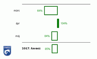 A 8. ábrán jól látható, hogy a tavasz első és utolsó hónapja száraznak adódott, a regisztrált mennyiség márciusban a normál 64%-a, májusban 84%-a volt. Áprilisban a megszokottnál 4%-kal több csapadék hullott. A teljes tavaszi időszak alatt 15%-kal kevesebb csapadék volt, mint általában.