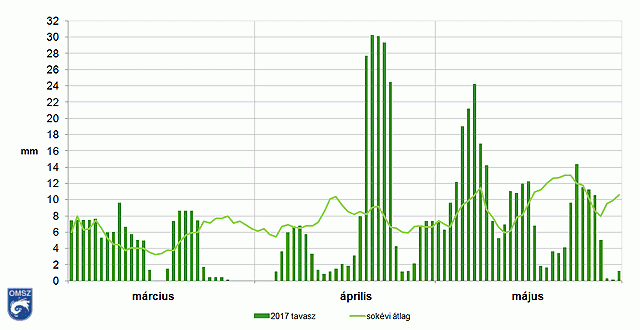 2017 tavasza a megszokottnál melegebb és szárazabb volt. Hőmérséklet szempontjából a március és a május a normálérték felett alakult. A március a második legmelegebbnek adódott a mérések 1901-es kezdete óta. A csapadékviszonyokat tekintve az egyes hónapok változatos képet mutattak. Míg az április csapadékosabb volt a szokásosnál, addig májusban, de leginkább márciusban jelentős csapadékhiány mutatkozott.