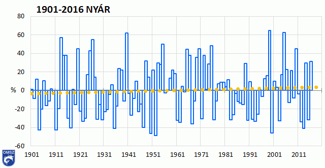 Az országos nyári csapadékösszegek százalékos eltérése a sokéves (1981-2010-es) átlagtól 1901 és 2016 között (interpolált adatok alapján)