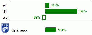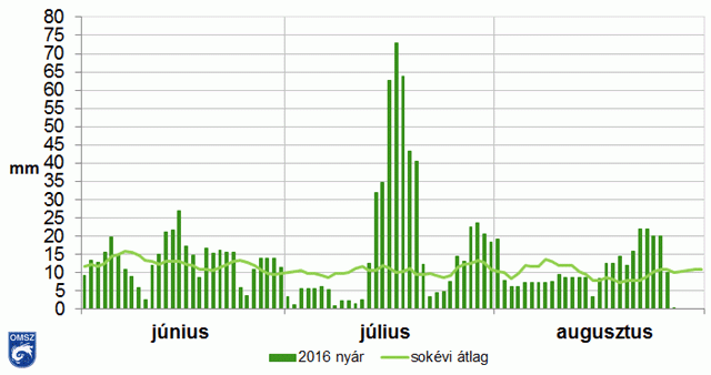 Összességében 2016 nyara igen csapadékos volt (6. ábra), különösen a július. A nyári hónapok csapadékösszege (253 mm) országos átlagban 60 mm-rel haladta meg az 1981-2010-es átlagos összeget (193 mm) Az évszakos átlagban több, mint 30%-os csapadéktöbblet valójában néhány napon hullott. A nyár folyamán összesen 4 településen mértünk 24 óra alatt több, mint 100 mm csapadékot (Gyomaendrőd, Lácacséke, Nemeskisfalud, Poroszló). A nyári felhőszakadások, heves zivatarok és jégesők több településen okoztak károkat, kiemelkedő volt a június 23-án, július 13-án és 16-án, illetve augusztus 22-én lezúduló csapadék mennyisége.