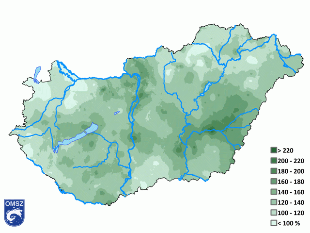 Ahogy 8. ábránkon is jól látható, jelentős csapadéktöbblettel telt a június és július hazánk területén. Júniusban a megszokott mennyiség 110%-a hullott le, de júliusban a már közel a duplája, mellyel az idei július a 2. legcsapadékosabb lett 1901 óta (II. táblázat). Csupán augusztusban hullott 11%-kal kevesebb csapadék, mint a sokéves átlag. Összességében az idei nyár a 21. legcsapadékosabb nyár hazánkban 1901 óta (II. táblázat).