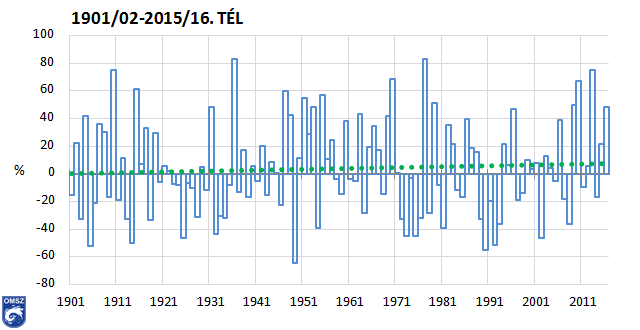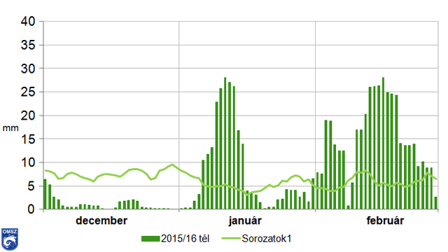 Az évszak hónapjait tekintve a februárt emelhetjük ki, mely a legcsapadékosabb volt az idei télen, és az elmúlt 116 év viszonylatában (II. táblázat). A 2016-os január volt a 10. legcsapadékosabb, a december pedig kimondottan száraznak bizonyult (113. legcsapadékosabb), ez volt a 3. legszárazabb december a mérések kezdete óta. Összességében a 2015/16-os tél a 15. legcsapadékosabb volt 1901 óta.