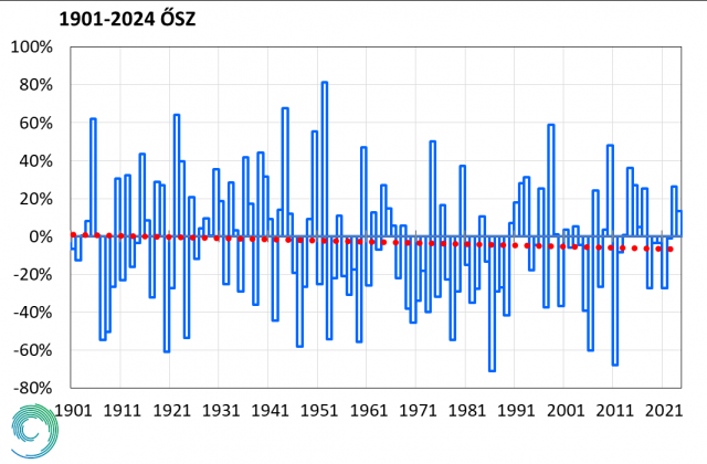 Az országos őszi csapadékösszegek százalékos eltérése a sokéves (1991-2020-as) átlagtól 1901 és 2024 között (interpolált adatok alapján)