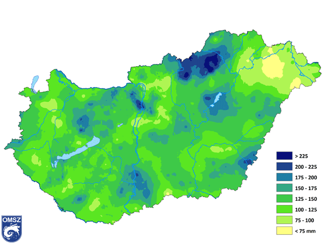 Jelentős területi eltérések adódtak az évszakos csapadékösszegekben (6. ábra). Jellemzően 100-175 mm közötti mennyiségeket jegyeztünk, ugyanakkor előfordultak ennél sokkal magasabb és alacsonyabb értékek is. 225 mm-t meghaladó mennyiségű eső esett például a Bükk és a Mátra területén, míg a Nyírség egyes részein a 75 mm-t sem érte el az átlagos évszakos összeg.