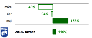 Ahogy a 8. ábrán is látható, a tavasz első hónapja különösen száraznak adódott, a regisztrált mennyiség a normál 50%-át sem érte el. Országos átlagban áprilisban a normálnak megfelelő, míg májusban azt 50%-kal meghaladó csapadék hullott hazánkban. Összességében a tavaszi időszakban a megszokott mennyiség 110%-a hullott le.