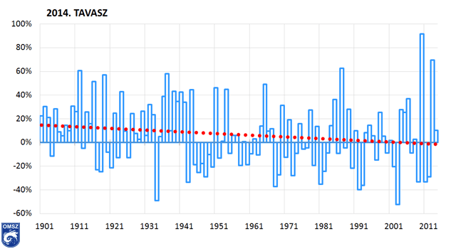 Az idei tavaszi csapadékösszeg átlagon felüli volt. Az elmúlt 114 év tavaszainak éves csapadékösszegéhez illesztett exponenciális trend csökkenést mutat (9. ábra). 2014 márciusa volt a múlt század eleje óta a 100. legcsapadékosabb (tehát a 15. legszárazabb), április a 63. helyre került. A tavaszi időszakot végül egy csapadékosabb május zárta, csak 11 csapadékosabb május előzte meg a 114 év alatt. Az idei tavasz összességében a 47. legcsapadékosabb tavasz lett 1901 óta.