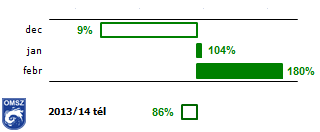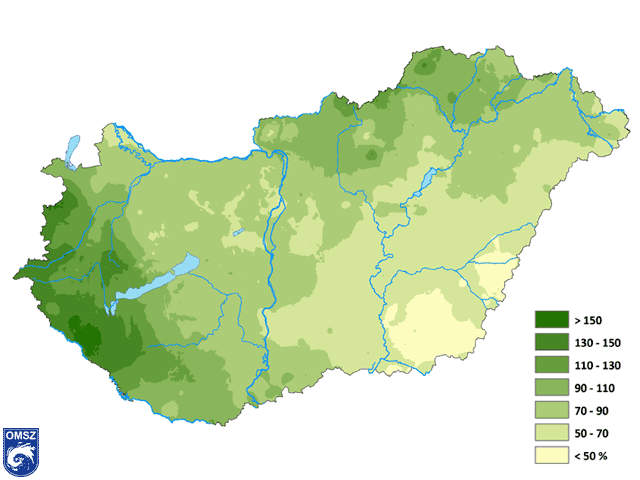 Ahogy a 8. ábrán is látható, a tél első hónapja különösen száraznak adódott, a regisztrált mennyiség a normál 10%-át sem érte el. Országos átlagban januárban a normálnak megfelelő, míg februárban azt közel kétszeresen meghaladó csapadék hullott hazánkban. Összességében a téli időszakban a megszokott mennyiség 86%-a hullott le.