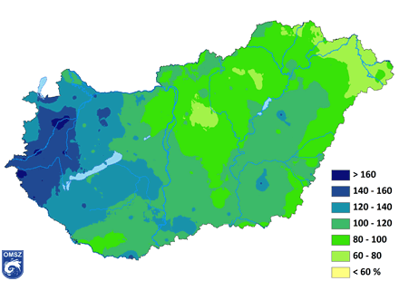 Az 1971-2000-es normálhoz viszonyítva átlag alatti és átlag feletti csapadékösszegek is jelentkeztek idén (7. ábra). Az előző térképhez hasonló, kelet-nyugati irányú növekvő értékeket láthatunk. A Dunántúlon jellemzően meghaladták az idei mennyiségek a sokéves átlagot, a nyugati határnál 1.5-szeres összegek is adódtak. Az Északi-középhegység, a Kiskunság, Pest megye és a keleti határszél területén azonban kicsivel elmaradtak az évszakos összegek a normáltól, 80-100%-os arány jellemezte ezeket az országrészeket.