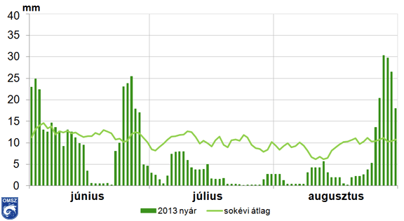 Az egyes nyári hónapokat sorra véve a június és az augusztus szárazabb volt a megszokottnál (75. és 85. legcsapadékosabb, azaz 39. és 29. legszárazabb 1901 óta), a legkiemelkedőbbnek azonban a júliusi csapadékhiány bizonyult. A 2013 júliusában jegyzett, igen alacsony csapadékösszegeknek köszönhetően az idei volt hazánkban a 3. legszárazabb július 1901 óta. A megszokottnál jóval szárazabb hónapok eredményeként 2013 nyara a 108. legcsapadékosabb, azaz a 6. legszárazabb nyár 1901 óta.