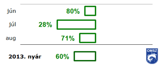 2013 nyári hónapjai közül egy sem érte el a megszokott csapadékmennyiséget országos átlagban (8. ábra) : júniusban a normál 80%-a, augusztusban pedig a sokéves átlag 71%-a hullott le. A legnagyobb eltérést júliusban láthatjuk; az 1971-2000 közötti sokéves átlag mindössze 28%-át jegyeztük a hónapban, mely rendkívül alacsony értéknek számít az idősorok 1901-es kezdete óta (II. táblázat).