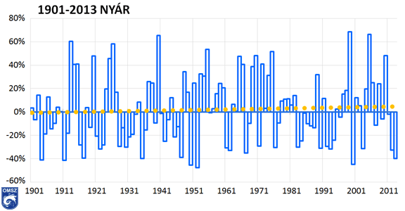 A nyári csapadékösszegek hosszú idősorát tekintve a 2013-as nyár a legszárazabbak között foglal helyet az 1901-től számított rangsorban (9. ábra).