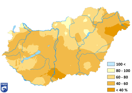 A nyári hónapok során lehullott csapadékmennyiség idén szinte mindenhol a megszokott értékek alatt maradt hazánkban (7. ábra). Az ország legnagyobb részén a normál 40-80%-a hullott le az idei nyár folyamán; a legcsapadékosabb területek északon jelentkeztek, itt a sokéves átlag 60-100%-át jegyeztük, a legszárazabb részeken ugyanakkor (dél és északkelet) az évszakos csapadékösszeg még a normál 40%-át sem érte el.