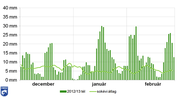 Ahogy a 8. ábrán is látható, minden téli hónapunkban több csapadék hullott a szokásosnál. A három hónap közül a februári csapadékösszeg a legmagasabb a normál 258%-ával, ezt követi a január 204%-kal, majd a december 120%-kal. Összességében a téli időszakban a megszokott csapadékmennyiség 184%-a hullott le.
